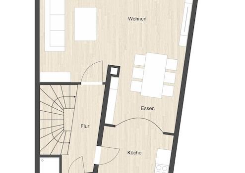 Im Erdgeschoss / Hochparterre befindet sich die Küche sowie der großzügige Wohn-/Essbereich mit direktem Zugang über die Terrasse in den Garten. In dieser Etage steht Ihnen noch ein Dusch/WC zur Verfügung.