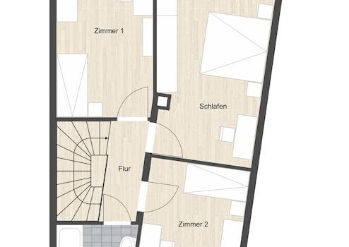 Im Obergeschoss befindet sich das Hauptbad sowie 2 Kinderzimmer und das Elternschlafzimmer mit Balkon.