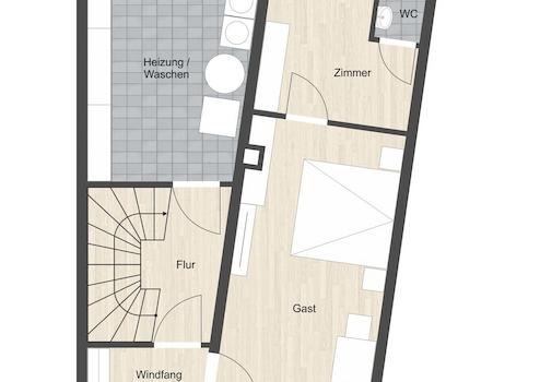 Der Haupteingang befindet sich im Souterrain, hier steht Ihnen ein Gästezimmer sowie ein WC und ein weiteres Zimmer zum Wohnen zur Verfügung.