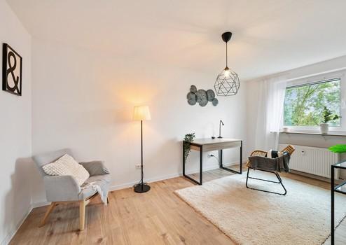 Die Wohnung verfügt über ein helles Wohnzimmer mit Zugang zum Balkon, ein Schlafzimmer sowie ein weiteres Zimmer, das sich ideal als Büro oder Arbeitszimmer eignet. Die separate Küche ist mit einer Einbauküche ausgestattet. Ein Badezimmer, ein separates WC sowie ein praktischer Flur runden das Raumangebot ab.