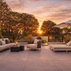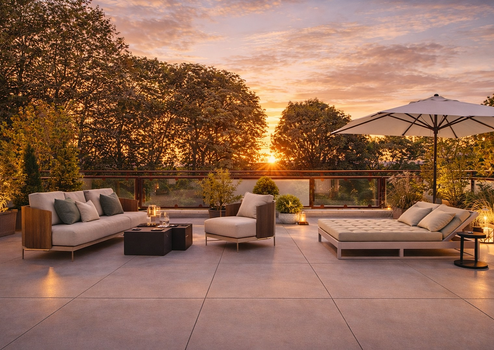 • Dachterrasse mit elektrischer Markise, Glasbrüstung und hellem Fliesenbelag