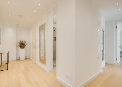 Beim Betreten des sehr gut erhaltenen Gebäude mit erst kürzlich luxuriös saniertem Entree mit Stuck und Lichtkonzept erreicht man über das Treppenhaus oder bequem mit dem Aufzug das Dachgeschoss. In der Wohnung angekommen, erwartet Sie die repräsentative Diele mit Platz für eine großzügige Garderobe. Ins Auge sticht sofort das mit viel Gespür abgestimmte Beleuchtungskonzept (Einbauspots, Nachtbeleuchtung), das in der Farbe Kaschmir gehaltene Weitzer Parkett sowie die in Streifendesign ausgeführten weißen, stumpf einschlagenden überhohen ca. 2,40m Innentüren welche ein ganz besonderes Lebensgefühl bewirken.