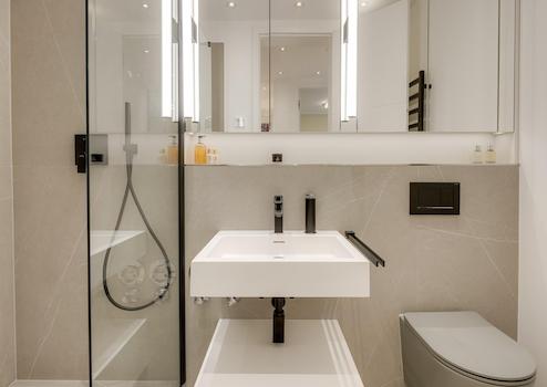 • Großzügige, integrierte und geflieste Nischenablage in der Dusche
