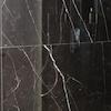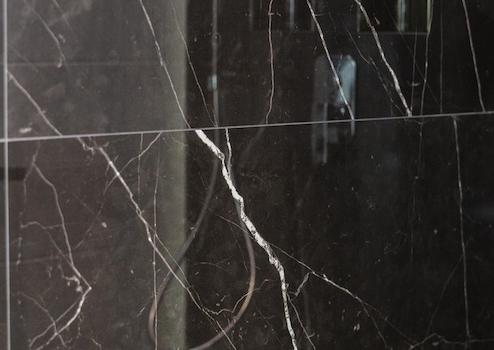 Die annährend raumhohen, italienischen, in schwarz glänzendem Nero-Marquina Marmorfinish ausgeführten Wandfliesen in Kombination mit den hellen, zeitlosen, großformatigen grauen Bodenfliesen in Natursteinoptik vermitteln mit dem Mineralguss-Doppelwaschbecken und dem Designerheizkörper Ribbon ein wohliges Gefühl von Wärme und Luxus.
