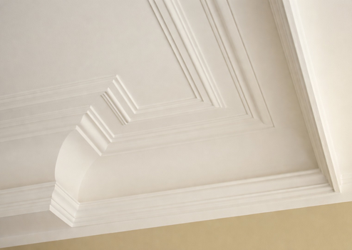 • Original-Stuckelemente im Wohnzimmer in Kombination mit Einbauspots