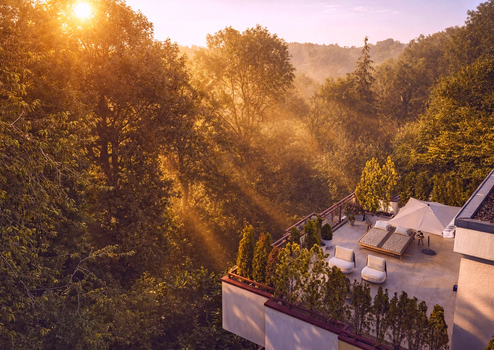 Dieser wird gekrönt mit dem Ausblick auf die traumhafte, einmalig große Dachterrasse (über 50qm) mit atemberaubenden Panoramablick, der sich weit über das Isartal und den majestätischen alten Baumbestand des Englischen Gartens zieht.