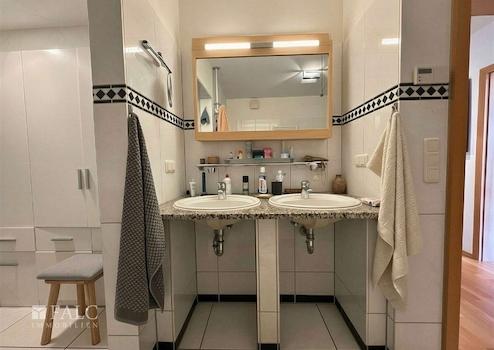 Das komfortable Wohnbad ist mit Eckbadewanne, separater Regendusche, Bidet und Doppelwaschtisch ausgestattet. Innerhalb des Badbereichs befindet sich zudem ein separater Raum, der bereits für den Einbau einer Sauna vorbereitet ist und sich ideal als privater Wellnessbereich nutzen lässt. Ergänzt wird die Wohnung durch ein zusätzliches Gäste-WC.