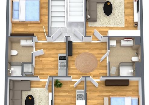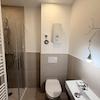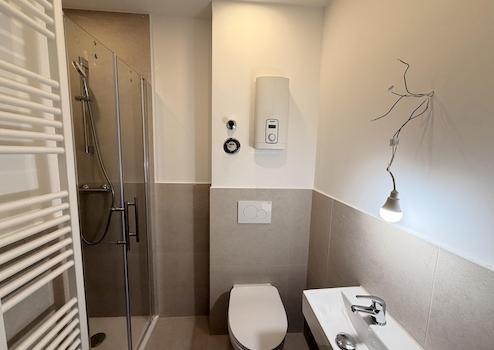 - Bäder: Modern geflieste Badezimmer mit Dusche, WC und Waschbecken.