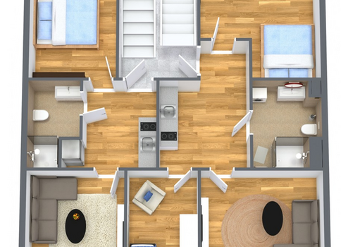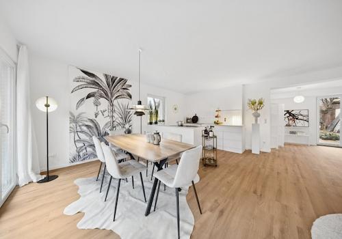 - Bodenbeläge: Hochwertiges Laminat mit V-Fuge, langlebig und optisch ansprechend.