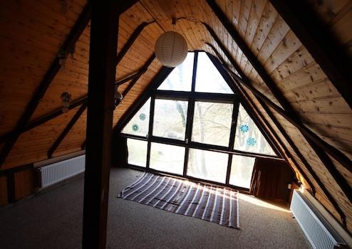 Im Bücherregal verbirgt sich eine Tür, die man nur findet, wenn man weiß, wo man suchen muss. Geheimnisvoll, fast märchenhaft. Sie führt in einen kleinen Flur, von dem aus ein besonderer Raum betreten wird – mit bodentiefen Fenstern, die den Blick in die Natur freigeben. Ein Raum voller Licht. Ein Raum zum Träumen.