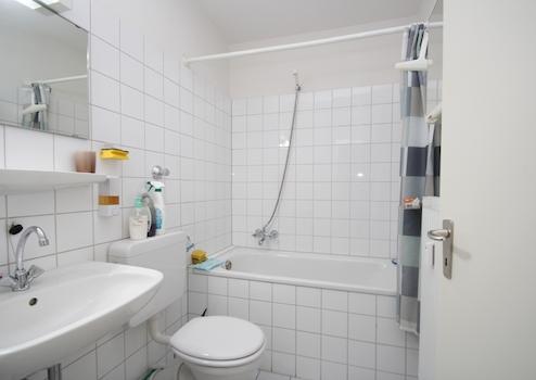 - Badezimmer, weiß gefliest, Badewanne, Waschbecken, WC