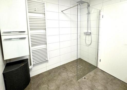 Wellness: Geräumiges modernes Wellnessbad mit Tageslicht, bodengleicher Dusche und Handtuchheizkörper, drei WCs auf zwei Ebenen