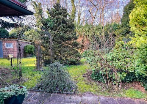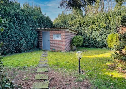 - eingezäunter Garten mit massivem Gartenhaus