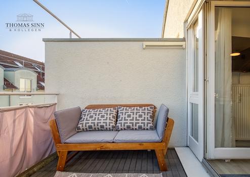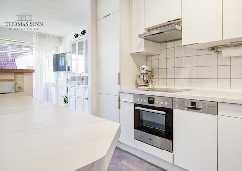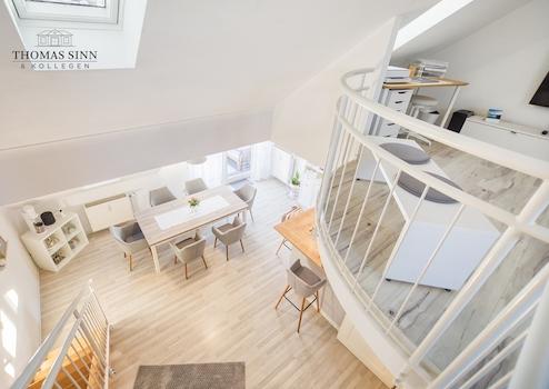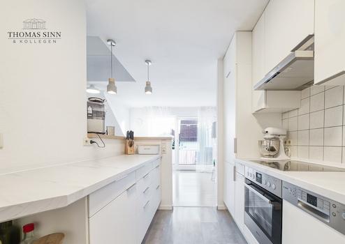 Im weiteren Verlauf gelangt man in den fantastischen Wohn-/Essbereich, der sich sehr offen und durch die Galerie sehr großzügig präsentiert. Der angrenzende Sonnenbalkon bietet genügend Platz für einen Tisch mit vier Stühlen und empfängt einen mit schönem, offenen Ausblick in Richtung Garten des Gebäudes. Direkt angrenzend befindet sich die offene, neuwertige Küche mit schöner Einbauküche und sämtlichen technischen Geräten.