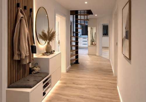 Von der Eingangsdiele gelangt man in Wohnzimmer, Küche, Bad,