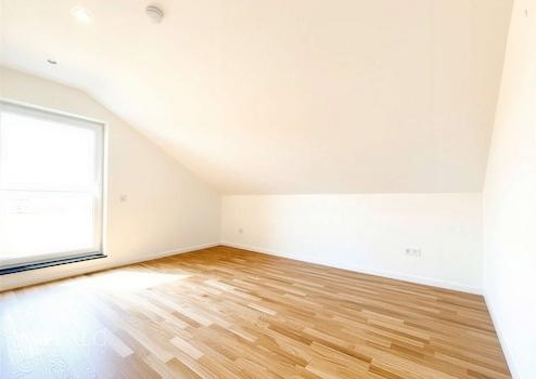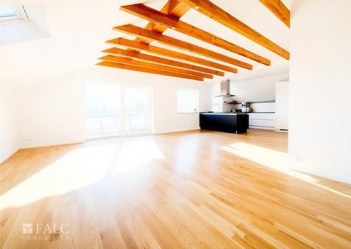 Die Wohnung verfügt über eine großzügige Wohnfläche von ca. 118 m² und bietet ein modernes Wohnkonzept mit offen gestalteten Bereichen. Besonders hervorzuheben ist der Wohn- und Essbereich mit offener Küche, dessen Decke bis zum Giebel geöffnet ist und so ein beeindruckendes Raumgefühl mit viel Licht und Großzügigkeit schafft. Sichtbare Holzbalken unterstreichen den wohnlichen Charakter.
