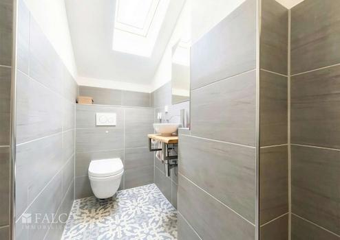 Bereits beim Betreten der Wohnung gelangt man in einen zentralen Flurbereich, der als Verteiler zu den einzelnen Räumen dient. Auf der rechten Seite befindet sich zunächst ein modern gestaltetes Gäste-WC, das durch seine zeitgemäße Gestaltung und ein Dachfenster für angenehme Lichtverhältnisse sorgt.