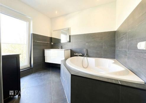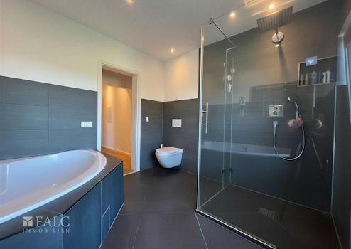 Das großzügige Badezimmer ist modern gestaltet und verfügt neben einer komfortablen Badewanne zusätzlich über eine separate Dusche. Hochwertige Fliesen, moderne Sanitärobjekte sowie Fensterflächen sorgen für eine angenehme Belichtung und ein zeitgemäßes Ambiente.