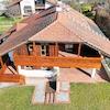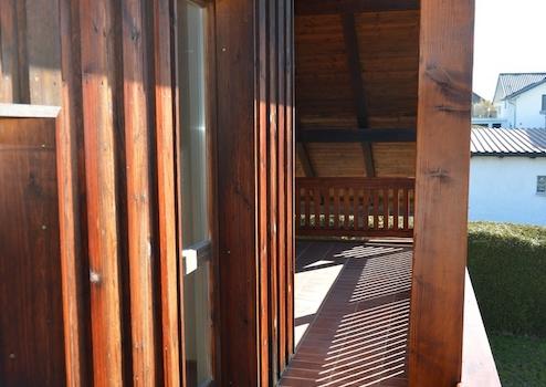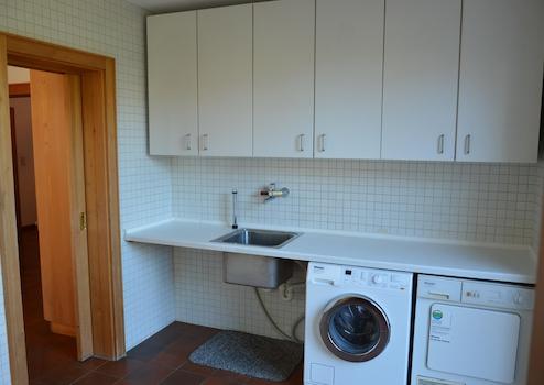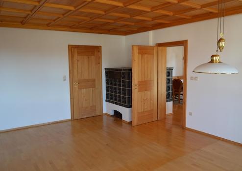 Von der Diele aus erreichen Sie ein kleines Arbeitszimmer, das großzügige Wohnzimmer mit stilvollem Kachelofen und Balkon sowie die Küche und den Essbereich. Direkt an die Küche angeschlossen befinden sich eine geräumige Waschküche und zwei praktische Abstellkammern. Von hier aus gelangen Sie außerdem direkt in den Garten zum überdachten Freisitz.