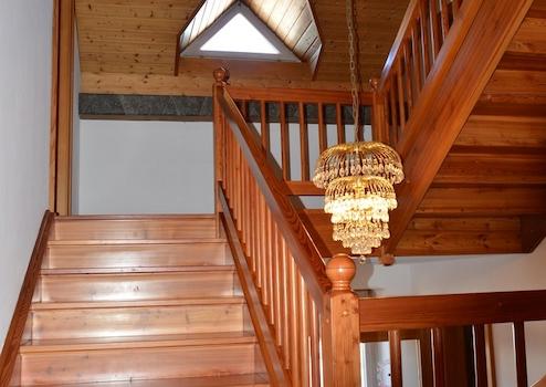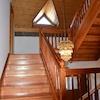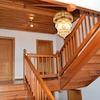 Über den Eingangsbereich mit Garderobe und kleinem Gäste-WC gelangen Sie über das imposante Treppenhaus aus Lärchenholz ins Erdgeschoss.