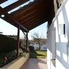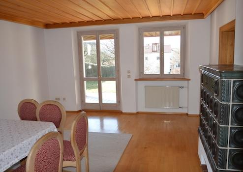 Sowohl von der Küche als auch von der Diele betreten Sie den großzügigen Essbereich mit Kachelofen und Zugang zum überdachten Freisitz.