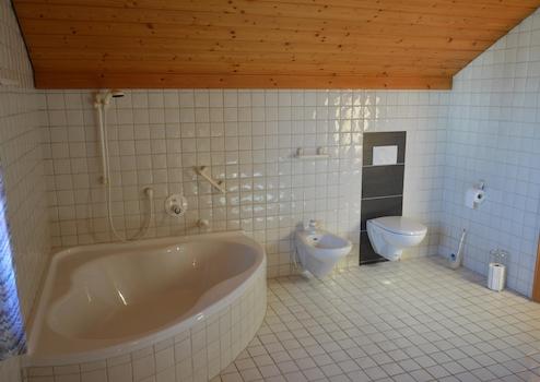 Im Obergeschoss betreten Sie über eine Ankleide das Hauptschlafzimmer mit Zugang zur überdachten Loggia sowie zum großen Badezimmer mit Badewanne, Dusche und Doppelwaschbecken.