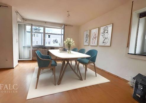 Der großzügige Wohn- und Essbereich öffnet sich zu einer sonnigen Loggia – ein idealer Platz zum Entspannen und Genießen, der das Wohngefühl harmonisch ins Freie erweitert.