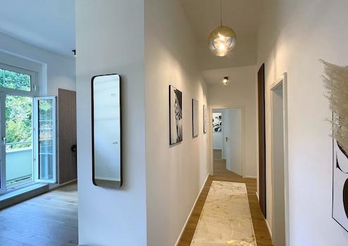 Die Wohnung erreichen Sie wahlweise über ein geräumiges Treppenhaus mit Natursteinbelag oder bequem per Aufzug. Beim Betreten der geräumigen 3-Zimmer Wohnung, welche zur Selbstnutzung hochwertigst saniert wurde, nimmt man die breiten und langen Landhausdielen mit V-Fuge wahr und es kommt sofort ein behagliches Gefühl auf. Die bis zu 3,30 m hohen Wohnräume diese Altbaujuwels schaffen ein edles und zugleich auch großzügiges und behagliches Wohnambiente.