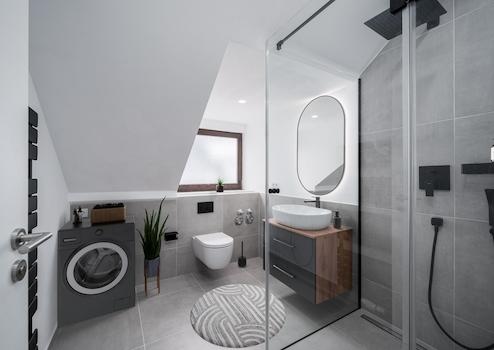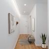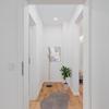 Garderobenbereich sowie ein modernes helles Badezimmer mit Tageslicht.