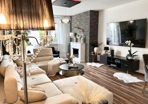 Herzstück ist der helle Wohn- und Essbereich mit ca. 35 m² Wohnfläche, großen Fensterflächen und Kamin. Von hier aus gelangt man direkt auf die Südterrasse und in den Gartenbereich.