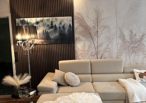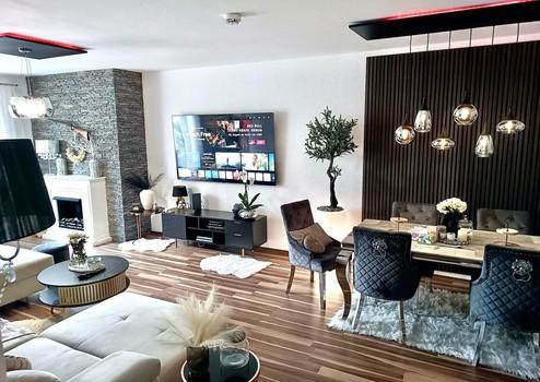 2021: Abgehängte Decken mit LED-Beleuchtung sowie Kaminportal im Wohnzimmer