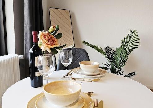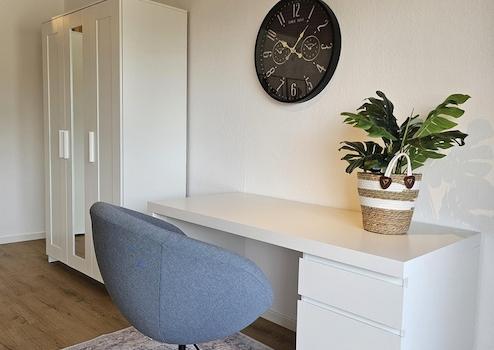Die Wohnung ist geschmackvoll und vollständig eingerichtet. Ein komfortables Boxspringbett (160 cm), ein Essbereich sowie ein Arbeitsplatz bieten eine praktische und gleichzeitig wohnliche Raumaufteilung.