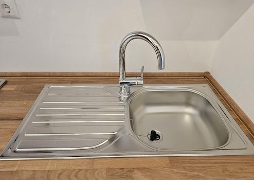 Die neue Einbauküche ist modern ausgestattet und fügt sich harmonisch in den Wohnbereich ein.