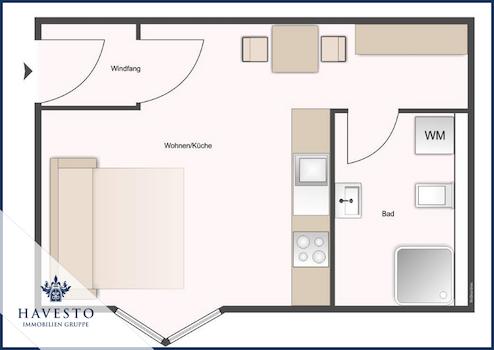 Der Wohnraum ist mit einem hellen Bodenbelag ausgestattet und bietet ausreichend Platz für Wohnen, Schlafen und Arbeiten. Die moderne Einbauküche ist etwa ein Jahr alt, technisch wie optisch in einem sehr gepflegten Zustand und mit hochwertigen Geräten ausgestattet, sauber, funktional und stilvoll integriert.