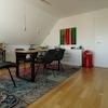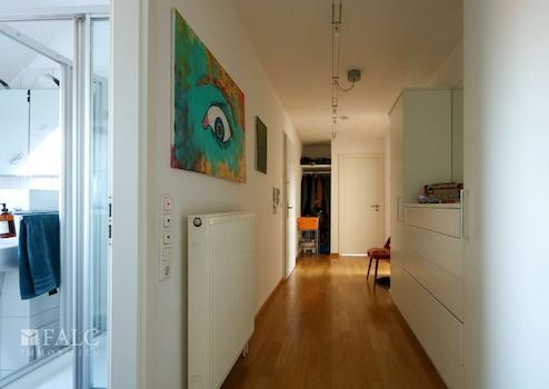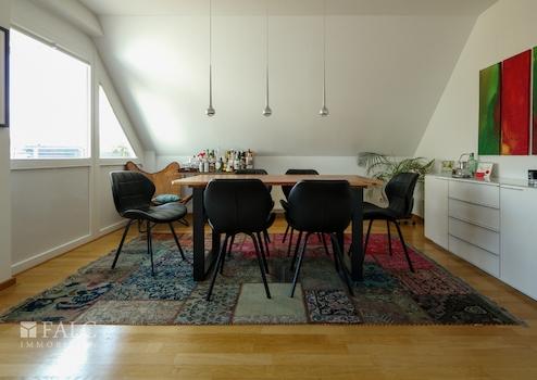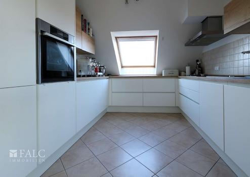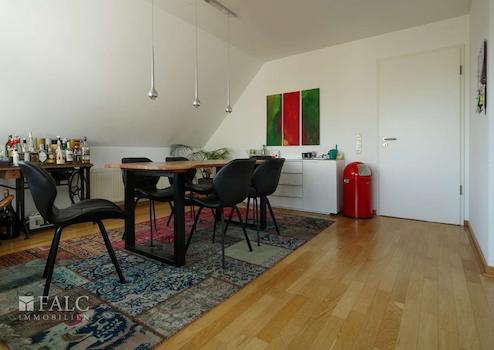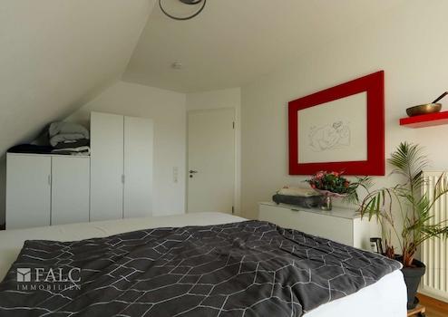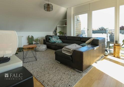 Sie finden hier eine lichtdurchflutete 4 Zimmerwohnung (ca. 110 m²), mit zwei Balkonen, zwei Dusch-Bädern und einem überbreitem Stellplatz in der Tiefgarage. Die Wohnfläche ist überwiegend mit massivem, hellem Eichen-Parkettboden belegt. Sie besticht durch ihre zentrale, dennoch ruhige Lage in Grevenbroich-Stadtmitte, mit der direkten Anbindung an die grüne Erftlandschaft. Diese sehr gepflegte, helle Wohnung liegt ohne weitere Nachbarwohnungen im Dachgeschoss eines ruhigen, 15 Parteienhauses. Der Aufzug fährt vom Kellergeschoss auf alle Etagen. Vom Eingangsbereich der Wohnung aus, gelangen Sie durch die geräumige Diele, wahlweise in den großen Wohn- und Essraum, mit offen gestalteter Küche, oder in den Schlaf-/Arbeits-/Gästezimmer-Trakt. Eine große Balkonterrasse, (Süd/Ost-Ausrichtung) ein weiterer Balkon, sowie die beiden Duschbäder runden die Großzügigkeit dieser Wohnung ab. Von den beiden Schlafzimmern aus haben Sie Zugang zum Balkon mit Westblick. Die leichten Dachschrägen verleihen der Wohnung zusätzliche Gemütlichkeit.