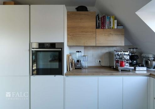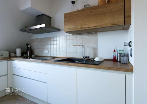 Einbauküche: (diese ist nicht Bestandteil des Kaufangebotes, da im Eigentum des Mieters, kann jedoch von ihm erworben werden) moderne, weiße Schrankfronten mit verdeckten Griffmulden, Spüle mit Mischbatterie, eingebautes Induktionskochfeld, Dunstabzugshaube in Edelstahl, Backofen gegenüber, in praktischer Arbeitshöhe eingebaut, Spülmaschine, großer Kühlschrank und zusätzlicher Gefrierschrank, Arbeitsplatte in warmer Holzoptik. Die Küchengeräte sind alles Markengeräte. Diese Küche ist fast neuwertig, da selten benutzt.