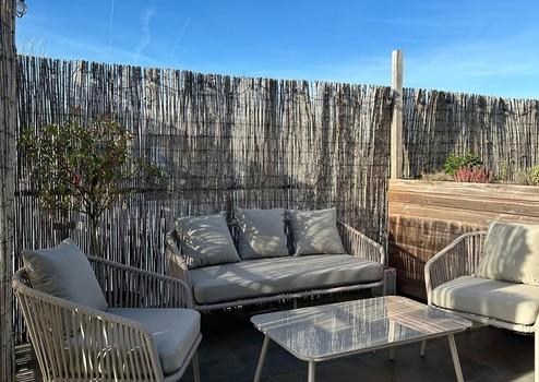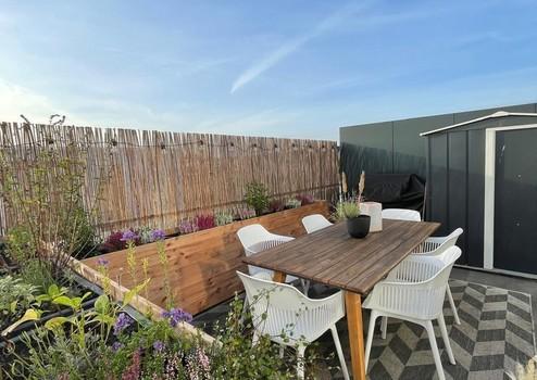 Die nach Westen ausgerichtete Dachterrasse ist rund 35 m² groß und grenzt an eine Grünfläche. Ein Hochbeet ist bereits vorhanden. Abends taucht die Sonne die Terrasse in warmes Licht – 35 m², auf denen man den Tag gerne ausklingen lässt.