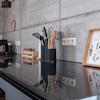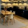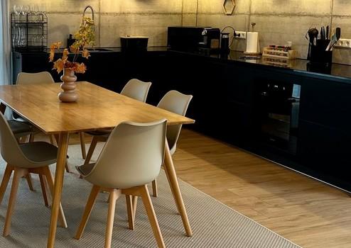 Die Ausstattung wurde bewusst hochwertig gewählt: großformatige italienische Fliesen in Holzdielenoptik durch alle Räume, Fußbodenheizung über Fernwärme, automatische Rollläden mit Somfy Tahoma-Steuerung per App. Die Designküche mit mattschwarzen grifflosen Fronten, schwarzen Granitarbeitsflächen, Bora-Kochfeld und Miele-Backofen ist dabei besonders hervorzuheben.