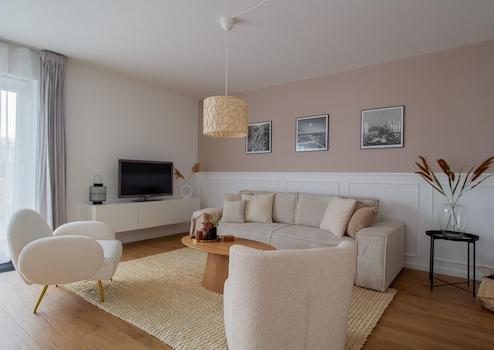Der offene Wohn- und Essbereich ist hell und großzügig geschnitten. Zwei Schlafzimmer sowie ein vollwertiges Bad mit Badewanne, separater Dusche und Doppelwaschtisch runden die Aufteilung ab. Ein Hauswirtschaftsraum in der Wohnung bietet Platz für Waschmaschine und Trockner.