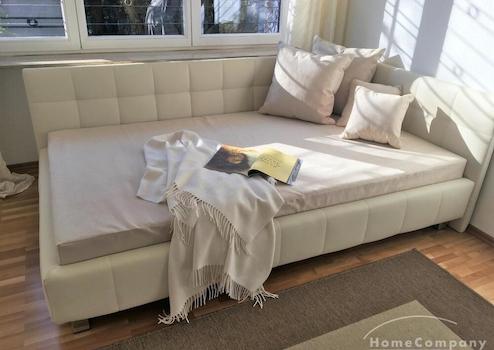 Schlafen: Bett Liegefläche 1.20 m x 2.00 m, Federkernmatratze, Lattenrost, Kopfteil mehrfach verstellbar, Bettkasten, tagsüber großzügiges Sofa