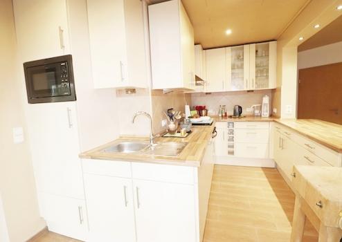 Ausgestattet ist die Wohnung mit Fliesen oder Laminat. Eine perfekt angepasste Einbauküche im offenen Wohnbereich bietet einen tollen Wohnkomfort. Die hochwertige Küche inklusive Elektrogeräten kann in der Wohnung verbleiben. Der Essbereich ist über eine Theke im Raum integriert. Aus dem Wohn-Essbereich gehen Sie direkt auf den Balkon (durch die gerade neu angebrachte Dämmung ist derzeit die Treppe in den Garten (mit Sondernutzungsrecht) nicht mehr verfügbar) und kann nach Ihren Vorstellungen neu gestaltet werden.