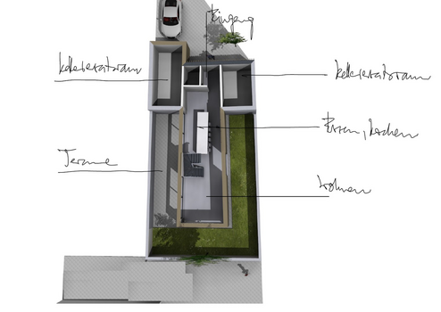 Für das Grundstück liegt eine architektonische Planung vor, die speziell auf den schmalen Grundstückszuschnitt abgestimmt wurde. Der Entwurf zeigt beispielhaft ein modernes Wohnhaus mit ca. 105 m² Wohnfläche auf zwei Ebenen sowie zusätzlichen Nebenräumen.