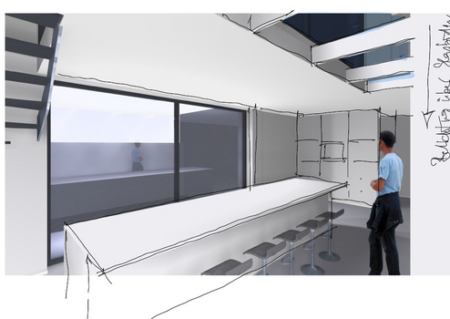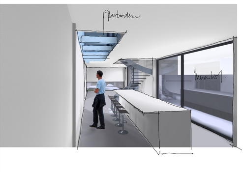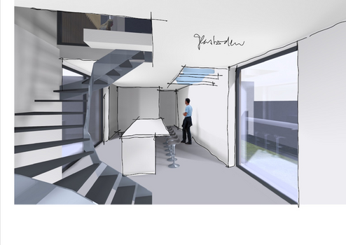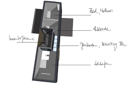 Vorgesehen sind unter anderem ein großzügiger Wohn-, Ess- und Küchenbereich, eine geschützte Innenterrasse (Patio), Gartenflächen sowie eine Loggia bzw. ein Balkon im Obergeschoss. Ein besonderes architektonisches Element bildet ein verglaster Laufsteg im Obergeschoss, der über dem Patio geführt wird.
