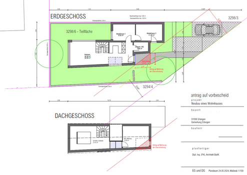 Die genehmigte Bauvoranfrage bezieht sich auf die Kubatur und die grundsätzliche Bebauung des Grundstücks. Die dargestellte Raumaufteilung dient als Entwurfsvorschlag und kann individuell angepasst werden.