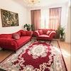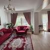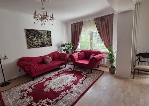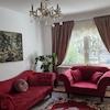 Im Wohnbereich befinden sich ein Sofa, ein Sessel, ein Couchtisch, ein eleganter Kristall-Kronleuchter, eine Stehlampe, ein Teppich sowie ein Esstisch und ein Arbeitstisch. Alle Möbel sind neu bzw. neuwertig.