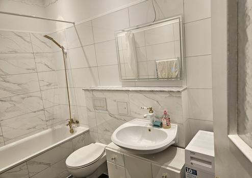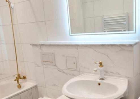 Das moderne, kernsanierte Badezimmer verfügt über eine Badewanne, einen eleganten Marmorboden, erneuerte Wasser- und Elektroleitungen, einen Handtuchheizkörper, eine Waschmaschine sowie eine Lüftung.
