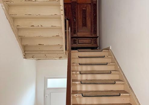 - Treppenhaus: Ein Anstrich der Holzteile steht noch aus. Teilweise wurde dieser schon vorbereitet (angeschliffen).
