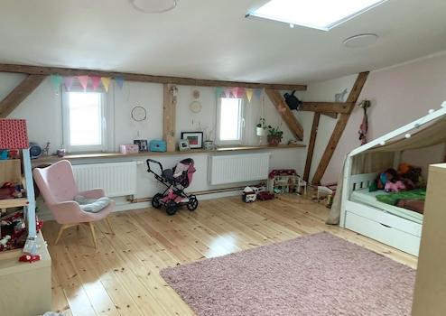 Wohnung 2 (Obergeschoss) verfügt über 4 Zimmer (Wohnküche, Schlaf-/ Arbeitszimmer, 2x Kinderzimmer) und ein Duschbad. Die Deckenhöhe in der Wohnküche und dem Schlaf-/ Arbeitszimmer beträgt rund 3,00m, in den beiden Kinderzimmern fällt das Flachdach von rund 2,50m auf 1,80m Deckenhöhe ab. Durch den offenen Ausbau wirken die Zimmer nicht zu niedrig. Auch diese Wohnung ist hochwertig ausgestattet - in allen Räumen sind Massivholzdielen verlegt. In jedem Raum liegt eine TV-Dose (Kabel) und zwei Netzwerkdosen an. Die Netzwerkdosen können über die Netzwerk-Verteilung (im Flur) aufgeschaltet werden. Die gut ausgestattete Einbauküche wurde mit einer massiven Eichenholz-Arbeitsplatte versehen. Das Duschbad ist nicht saniert worden, ist aber funktional ausgestattet (2000er).