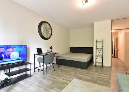 Die Wohnung ist voll möbliert und ausgestattet mit einem komfortablen Boxspringbett, einem Sofa mit zusätzlicher Schlaffunktion für einen Gast, einem Schreibtisch sowie einem Fernseher.