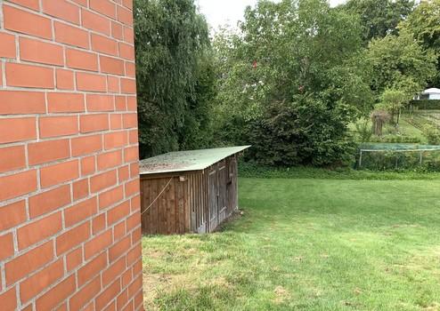 Das längliche Grundstück ist auf der Gartenseite teilweise leicht abfallend, ein größerer Holzschuppen (siehe Foto) ist im Kaufpreis enthalten. Bei der im Grundriss aufgeführten Terrasse handelt es sich um ein Beispiel.